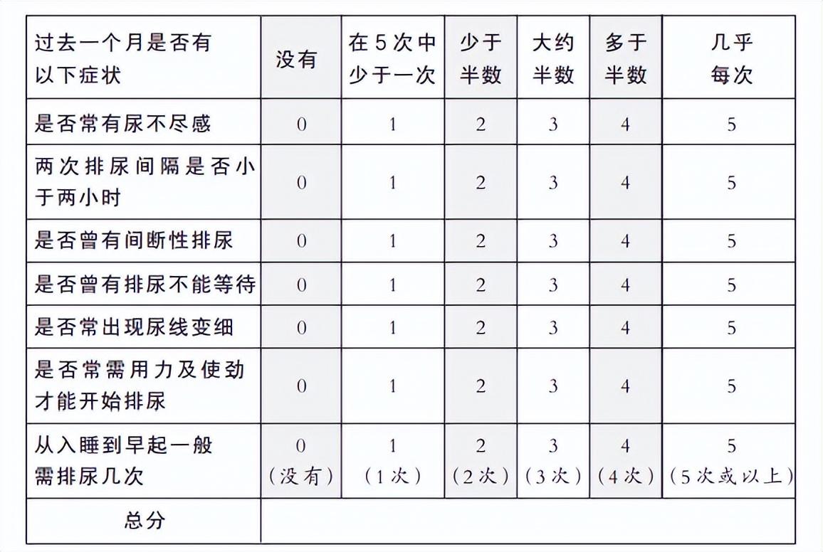 國際前列腺症狀評分(IPSS評分)是目前國際公認的判斷良性前列腺增生患者症狀嚴重程度的最佳手段,可通過評分表來自評。