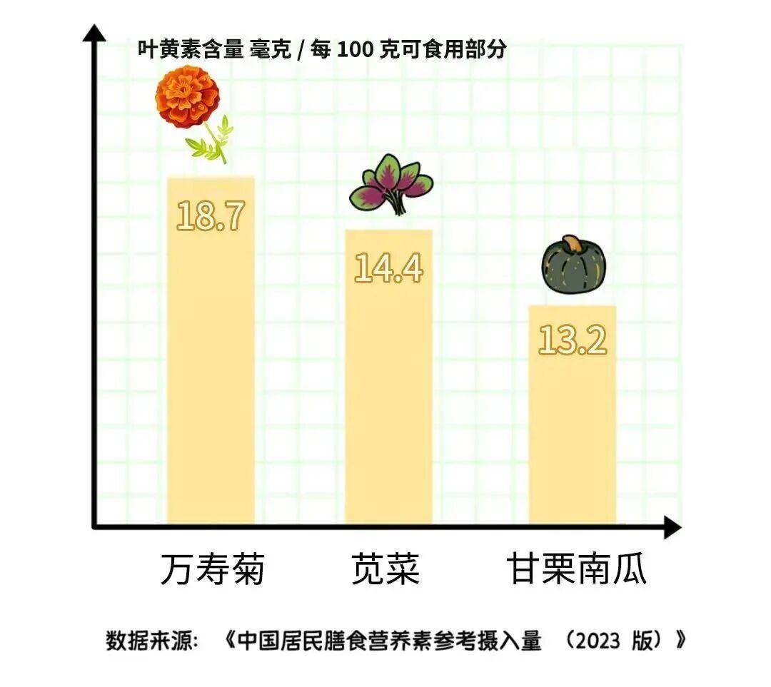 一般來說,深色食物中含有的這類營養會比較豐富,比如萬壽菊、韭菜、菠菜、莧菜、南瓜、西蘭花等。