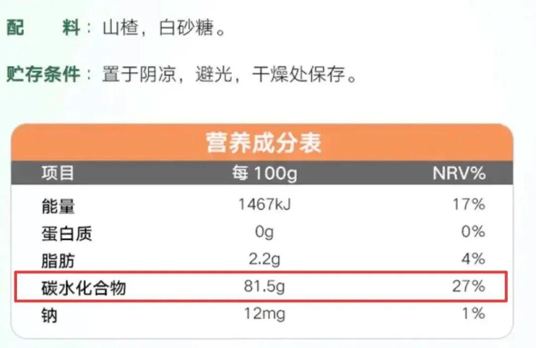 下圖中,山楂條碳水化合物含量爲 81.5 g / 100 g,山楂本身的碳水化合物含量約爲 25.1 g / 100 g,那麼白砂糖的含量可能達到 50 g 以上,相當於娃每喫下一根山楂條,半根都是白砂糖。