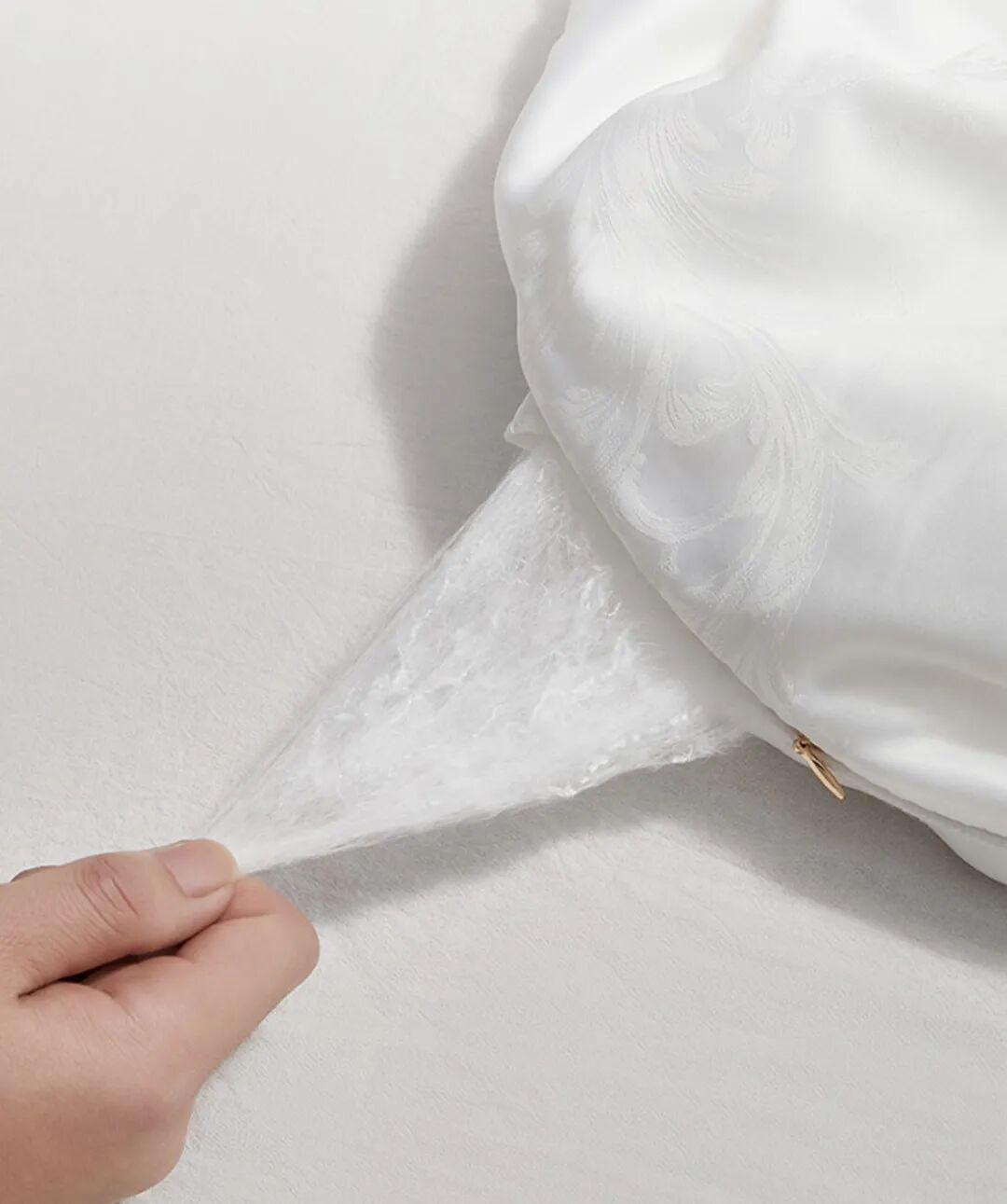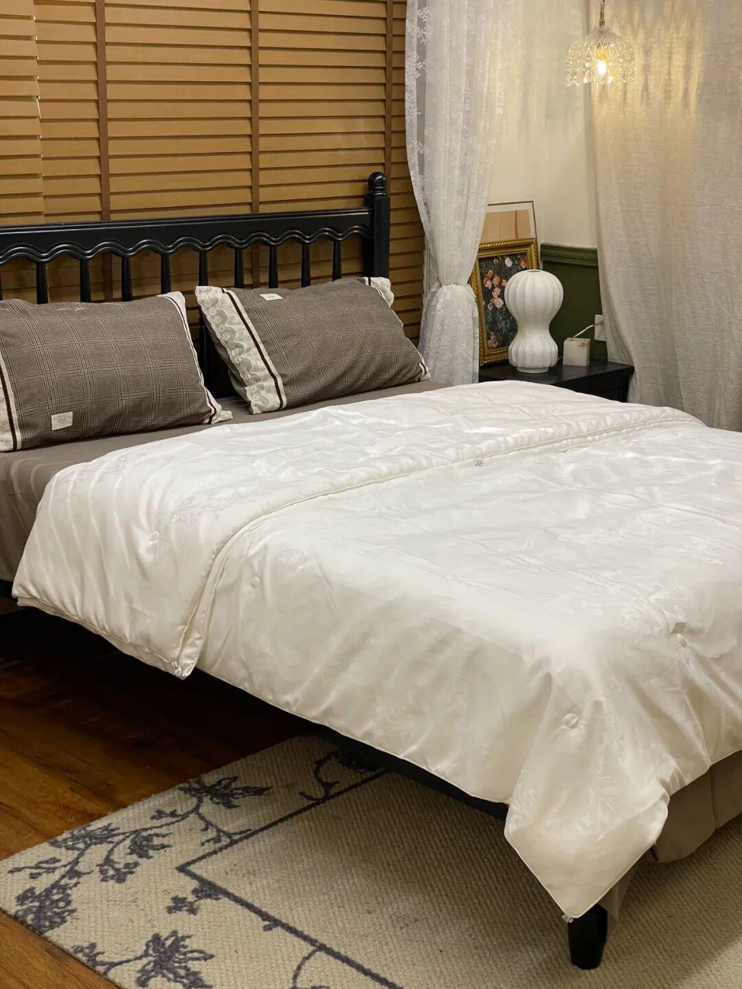 而這句話肯定了蠶絲被保暖性能卓越的同時,也表現了它的另一大特點——輕盈柔軟。相較於厚重的棉被,蠶絲被蓋在身上不會壓到你翻身都累,也不至於太輕空落落的,那叫一個恰到好處的蓬潤回彈、貼身細膩。