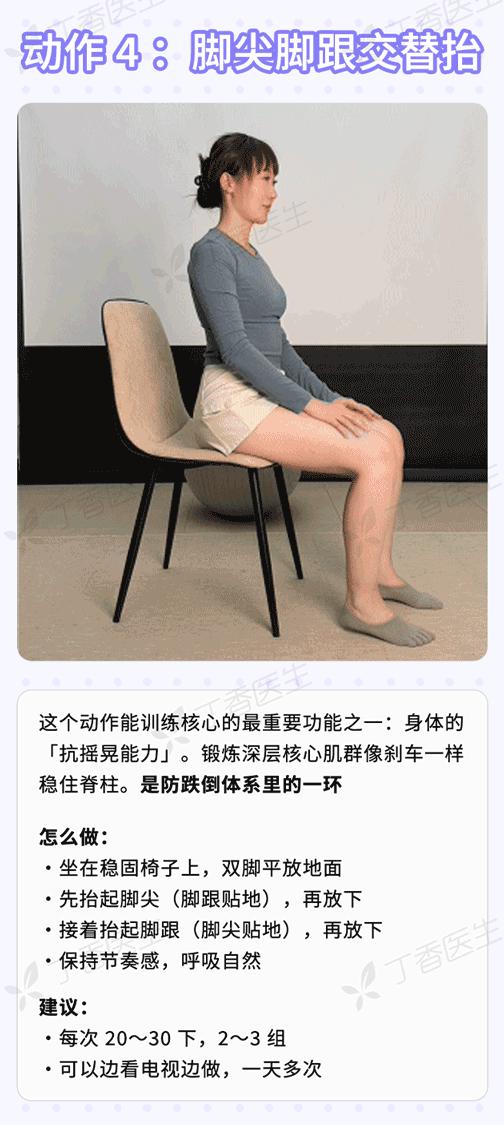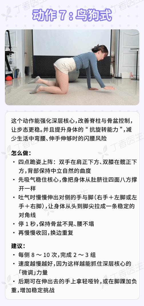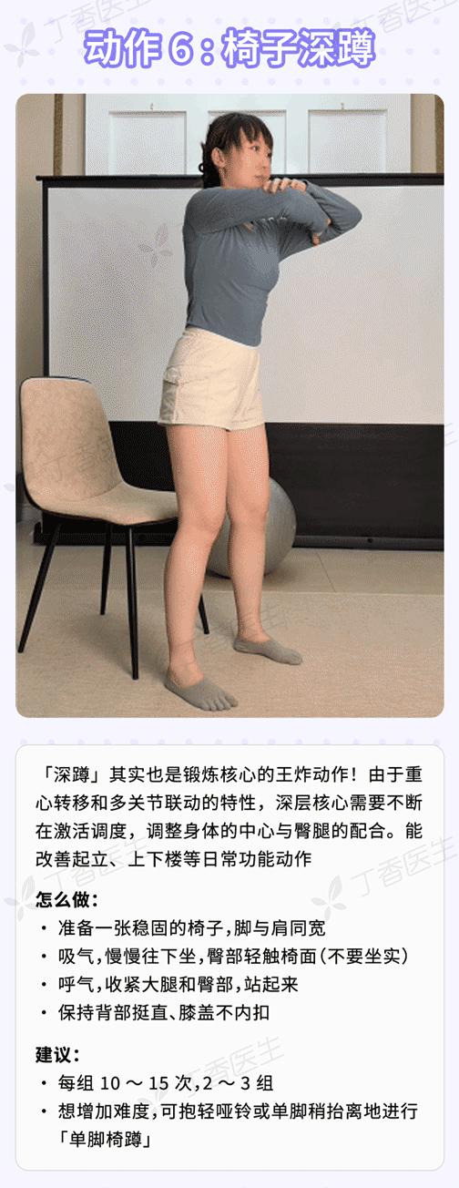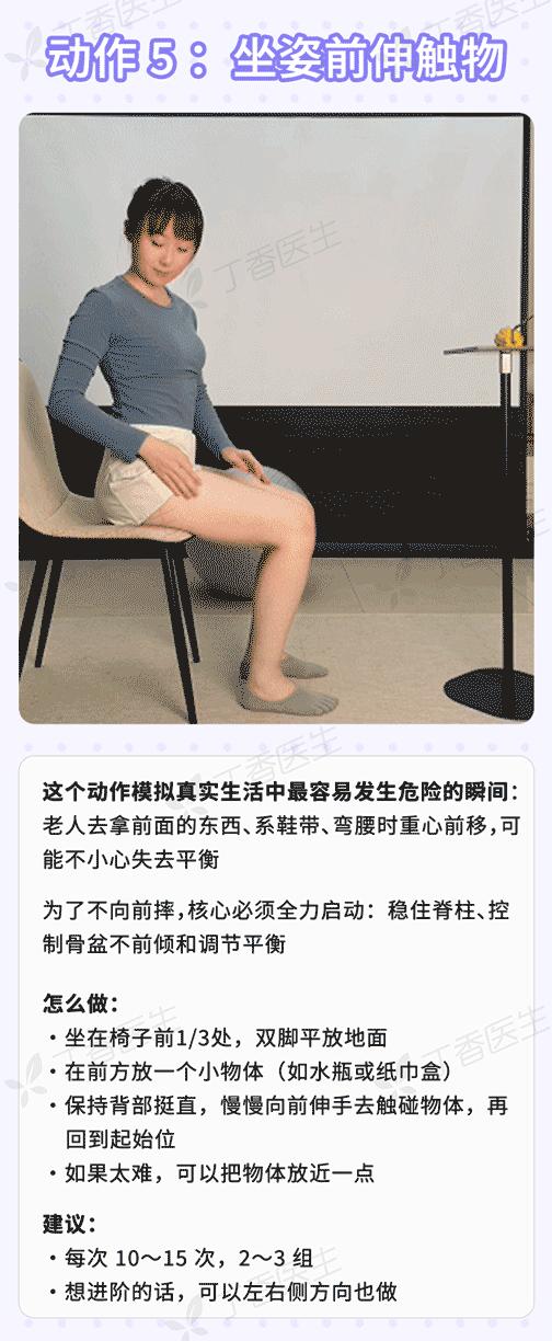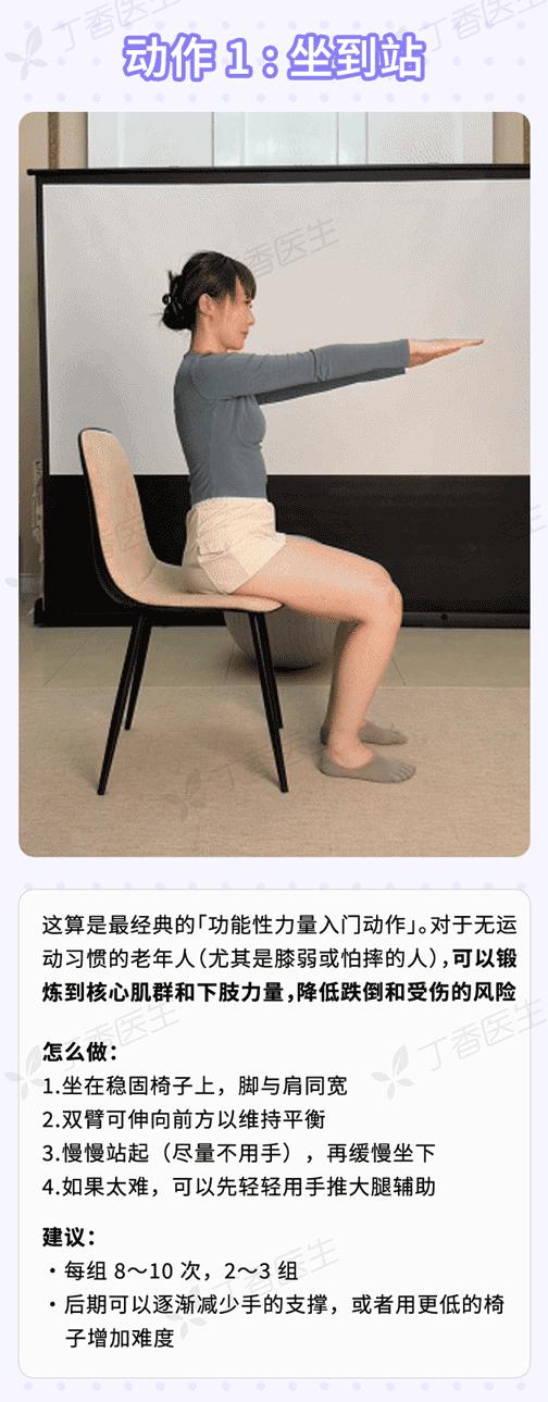 爲了幫不同基礎的老人都能「對號入座」,丁香醫生聯合運動學專家,給出 7 個推薦練習的核心訓練動作。