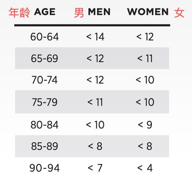 美國疾控中心給出的判定方法是:根據年齡和性別,看看是否能達到下表中的數量。如果小於對應的數字,就說明存在跌倒風險。