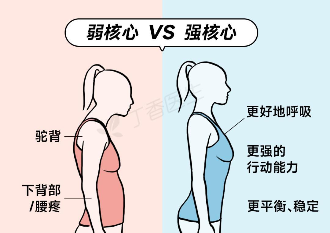 核心弱,肌肉沒力氣,提重物、彎腰的時候壓力全落在腰椎骨骼上了,就容易腰疼。另外還可能引起其他肌肉代償,還會導致骨盆前傾、駝背等不良體態。各種疼痛症狀也會加重。