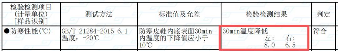 在 -20 ℃ 的情況下,鞋內底表面 30 分鐘內溫度下降值爲左 8 ℃,右 6.5 攝氏度。