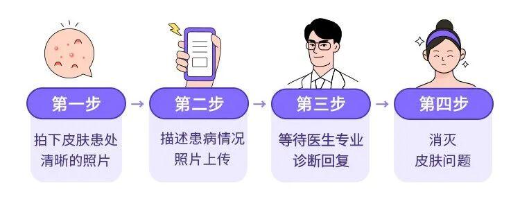 過程非常簡單,僅需 4 步,把自己情況拍照給醫生,描述一下症狀、患病時間等,醫生在線就能幫你仔細分析並給出專業建議、開藥送到家,快捷方便。