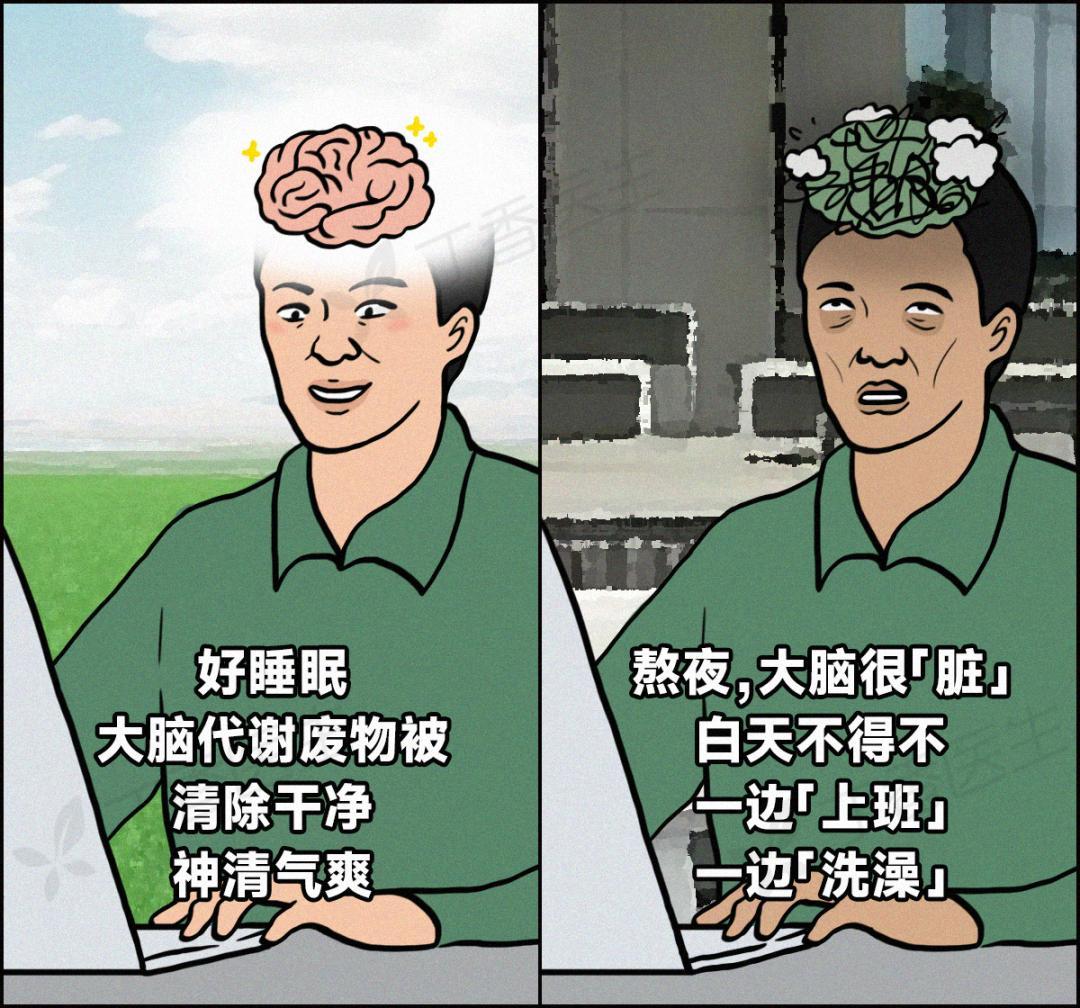 正常情況下,腦子會在深度睡眠時清除掉代謝廢物,但熬夜沒睡夠,大腦又不能放着不洗,那就只能「白天上班時偷偷洗澡」了。