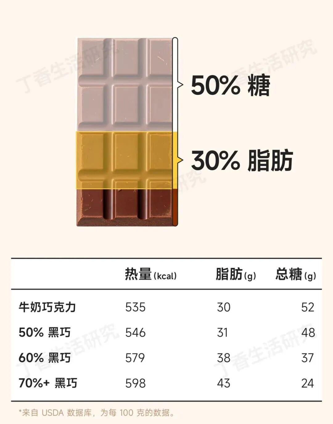巧克力中大約 80% 是脂肪 + 糖,純度越高,糖越少,脂肪越多。