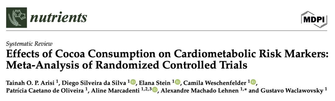 [1] Arisi, T. O. P., da Silva, D. S., Stein, E., Weschenfelder, C., de Oliveira, P. C., Marcadenti, A., Lehnen, A. M., & Waclawovsky, G. (2024). Effects of Cocoa Consumption on Cardiometabolic Risk Markers: Meta-Analysis of Randomized Controlled Trials. Nutrients, 16(7), 1919.
