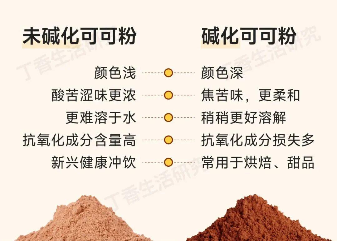 鹼化可可粉:在製作過程中,加入了碳酸鉀等鹼性物質,味道更柔和、溶解更容易,但可可活性物質會有一定程度的損失。
