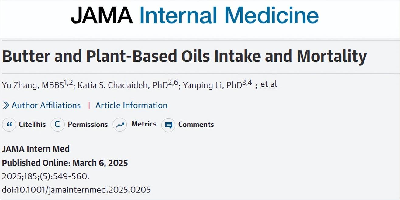 類似研究還有很多,其中發表在《JAMA Internal Medicine》期刊上一項大規模隊列研究,通過跟蹤221054名參與者分別分爲攝入黃油和植物油組,在經過33年的調查記錄,發現黃油攝入組全因死亡率和癌症死亡率更高,而植物油攝入組則表現相反,建議用植物油代替動物油,以降低早死風險。