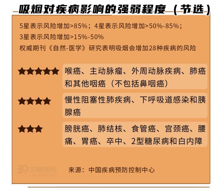 有數據顯示,戒菸一年後,出現冠心病的風險會比長期吸菸的人低一半,戒菸超過5年,15年內不復吸的,中風風險也會恢復到正常人水平。