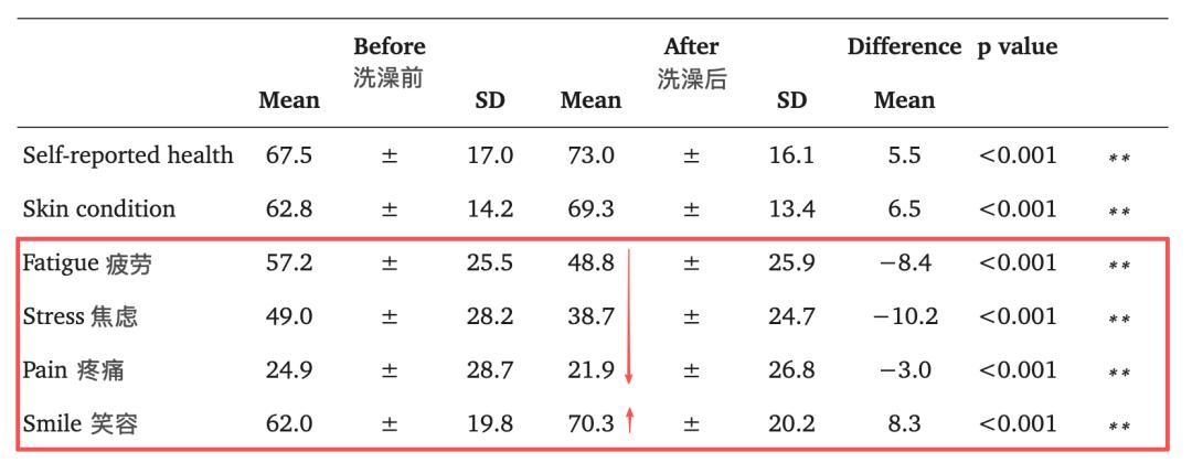 一項來自日本的橫斷面研究發現,每天用熱水洗澡的人主觀健康狀況良好,睡眠和休息充足,壓力水平低,主觀幸福感高。泡澡能讓疲勞、壓力和疼痛的評分進一步大大降低。[7]