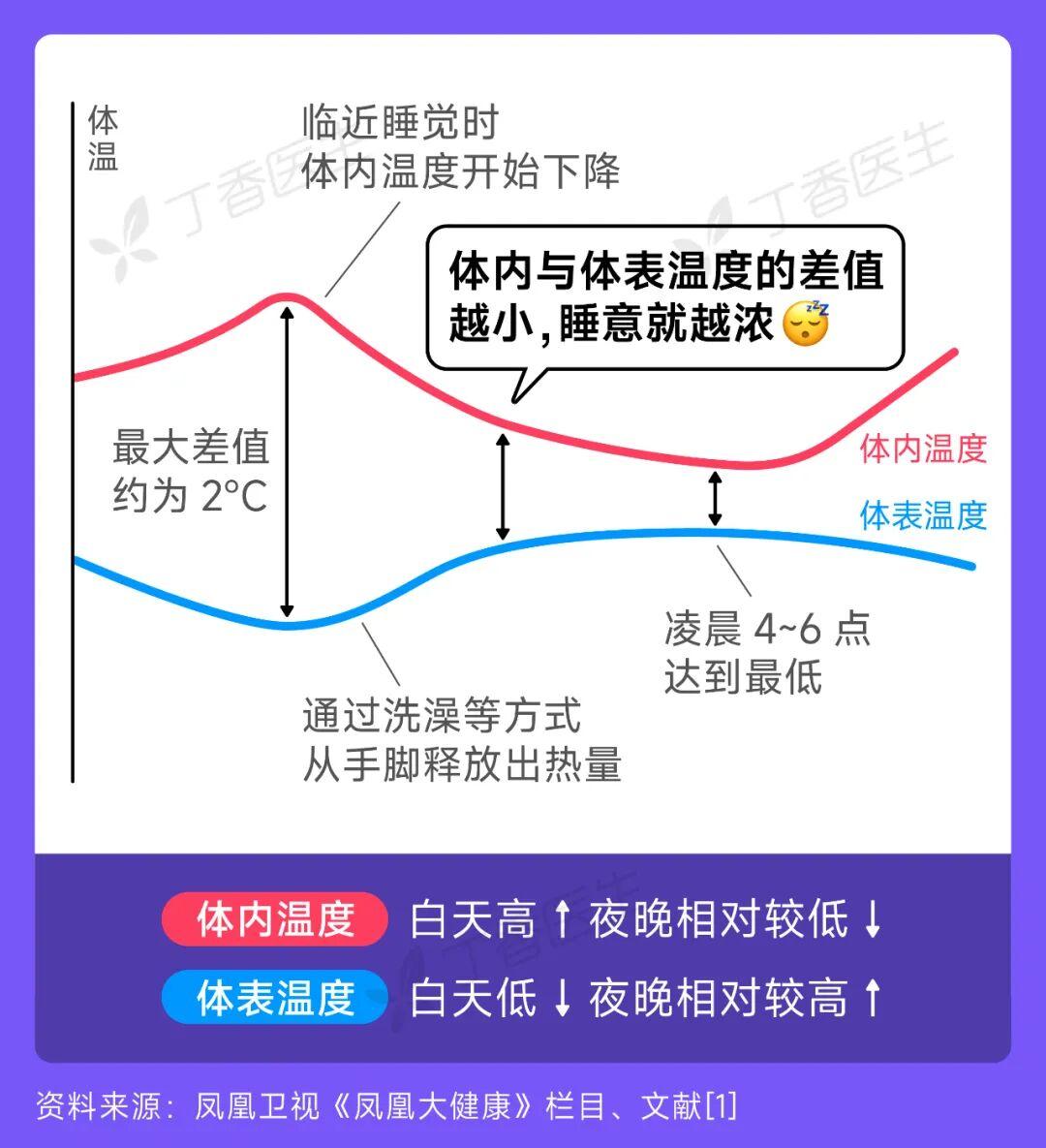 軀幹、心臟等溫度,叫體內溫度,也叫核心溫度,手臂、腳等溫度,叫體表溫度。身體是有晝夜節律的,一到晚上,身體會降低核心溫度,縮小「體內 — 體表溫差度」來幫助入睡。