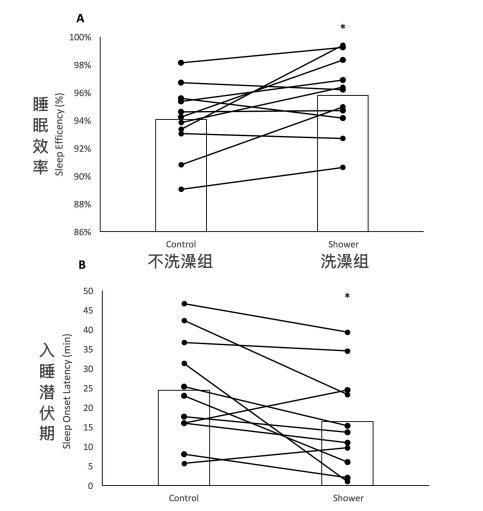 睡前不洗澡組 vs 睡前洗 10 分鐘熱水澡組睡前洗熱水澡的運動員們的睡眠效率更高,入睡潛伏期更短。
