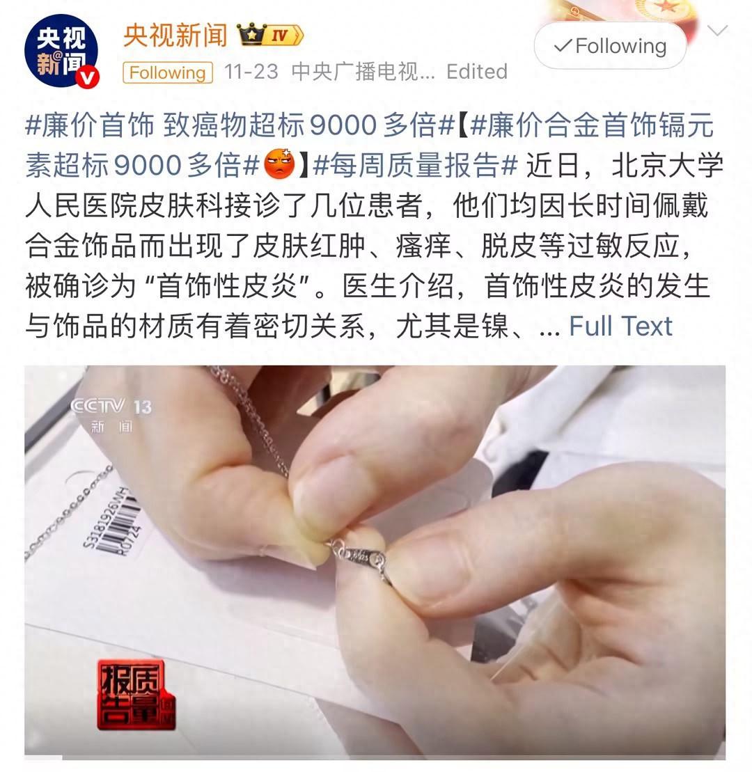 央視再曝!因首飾引發的健康問題再次引發熱議。
