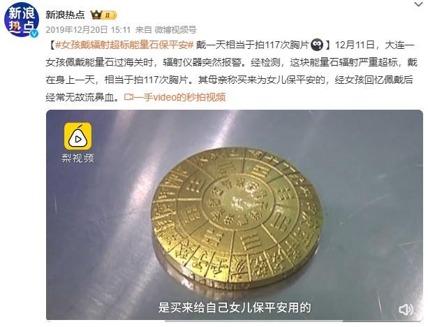央視曾報告過大連海關查獲的一袋能量石被檢出超標輻射量,只要隨身戴一天就相當於做了117次胸片。