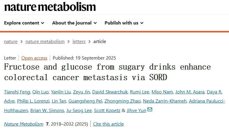 結果發現,果糖、葡萄糖或顯著增加結直腸癌細胞的轉移、侵襲能力,其中山梨醇脫氫酶起到關鍵作用。該物質類似於代謝的開關,一旦攝入含糖飲料開關就會被打開,腫瘤細胞會因此而從飲食內獲取果糖,成爲轉移的“原動力”。