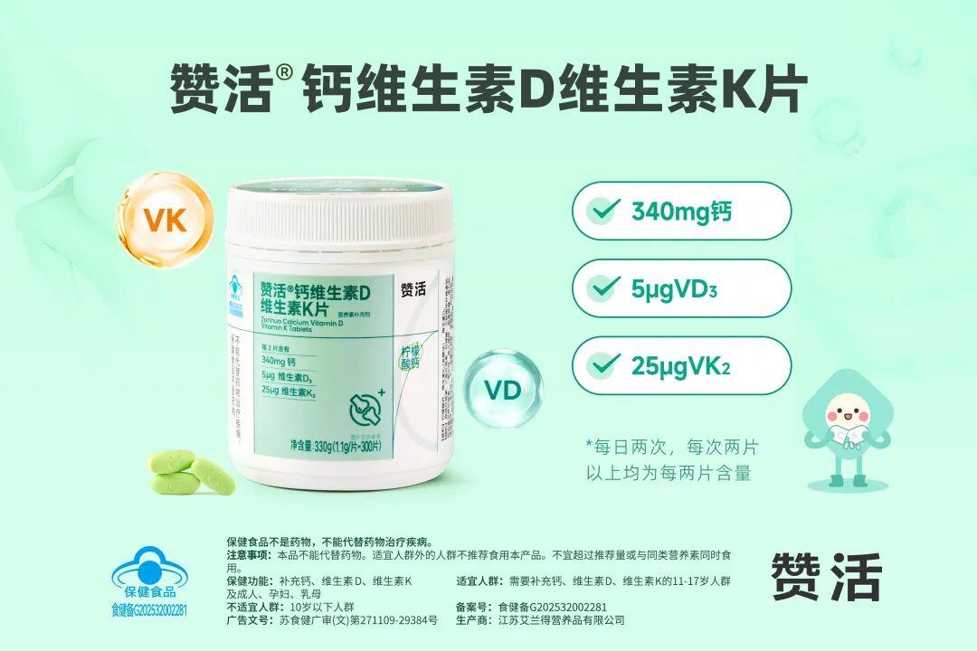 贊活這款鈣片添加了像引導員一樣的狠角色,每 2 片含有 25 μg 維生素 K2,能參與骨代謝,幫助鈣鹽沉積到骨頭裏!