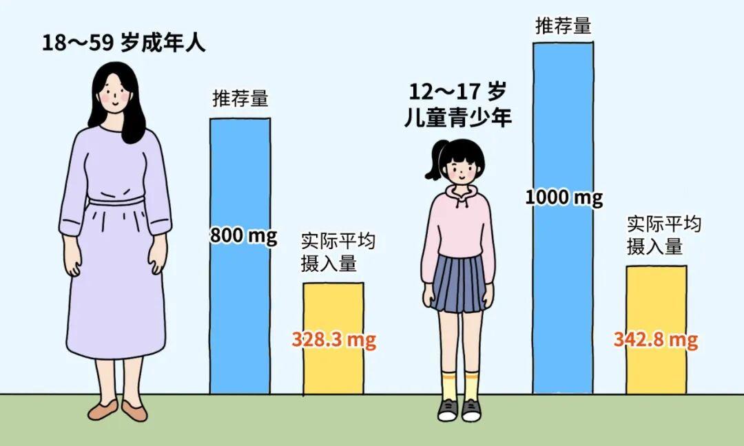 中國 18~59 歲成年人,平均每人每天鈣攝入量僅有 328.3 mg,只達到推薦攝入量的 40% 左右,連一半都不夠。12~17 歲青少年平均每人日鈣攝入量爲 342.8mg,遠遠低於推薦量。[2]