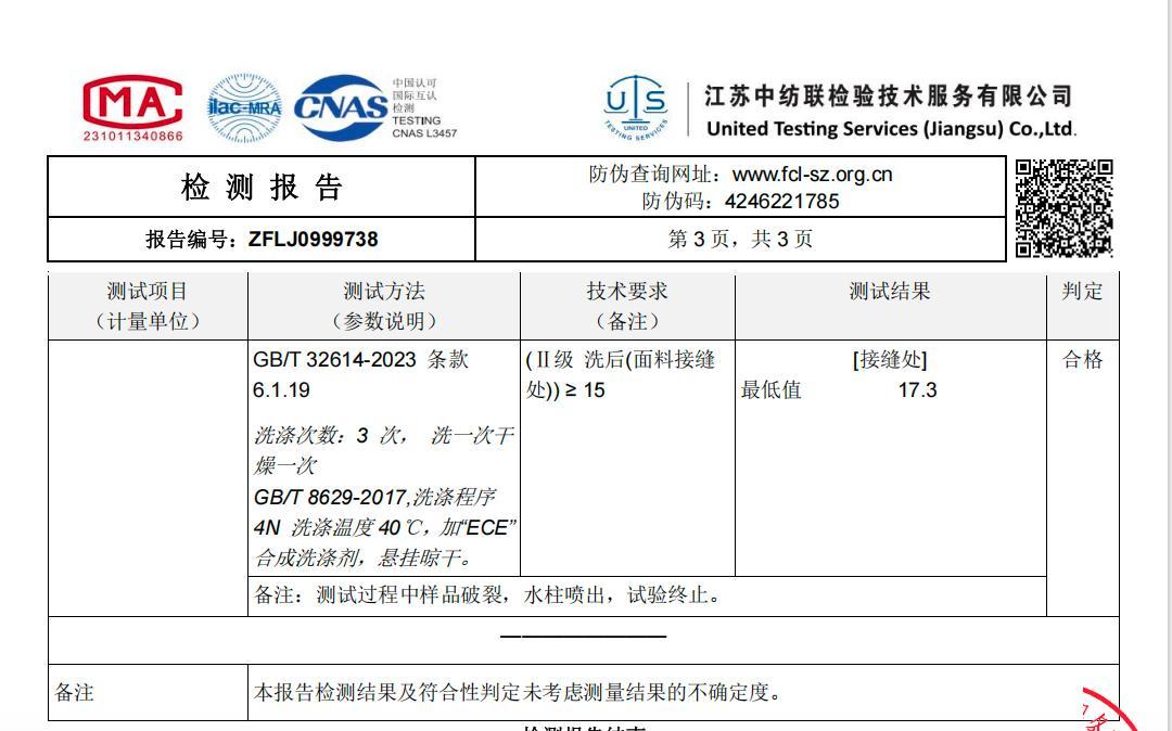 經專業檢測:不論洗前、洗後,接縫處靜水壓也是大於國標要求!
