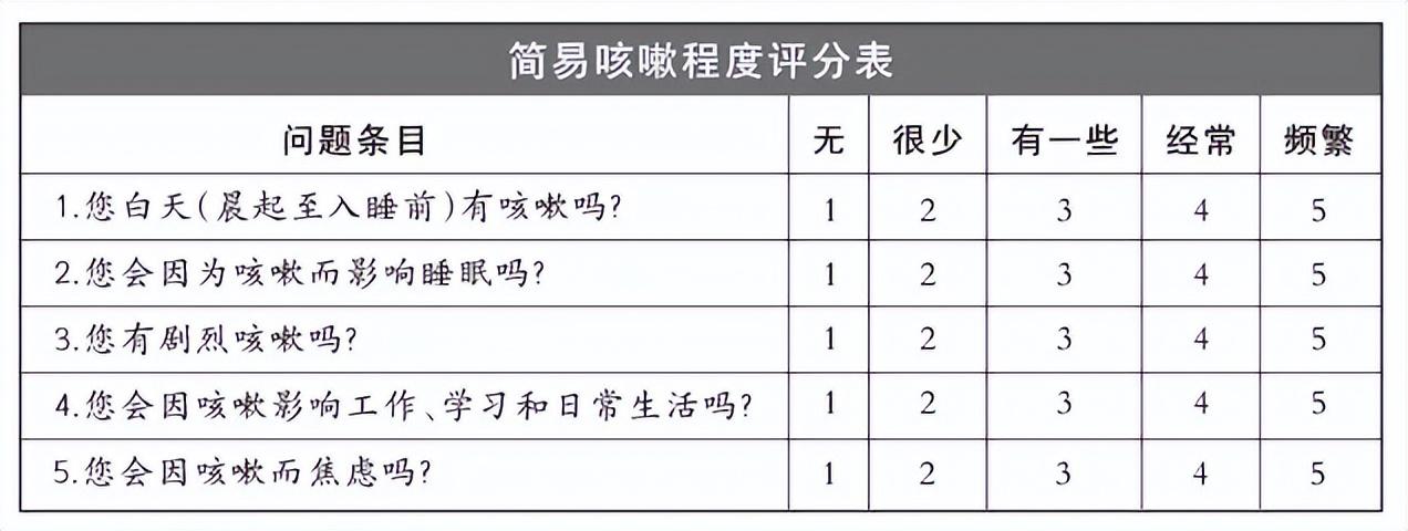 首都醫科大學附屬北京朝陽醫院呼吸與危重症醫學科主任醫師安立表示,“簡易咳嗽程度評分表”可初步評估病情,總分5~25 分,分數越高代表咳嗽程度越重。
