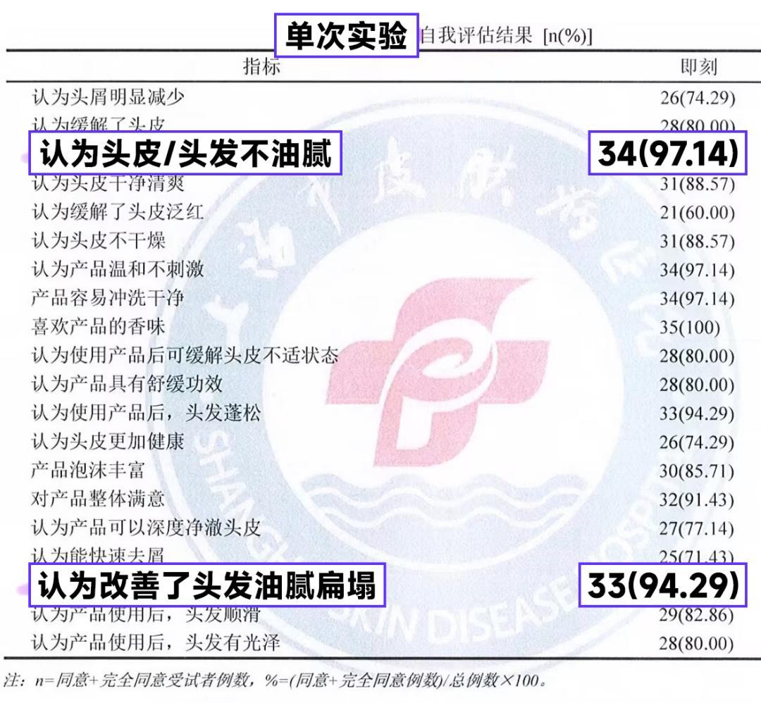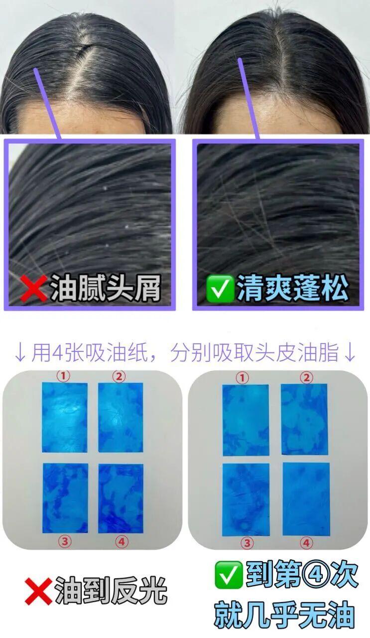 臨牀檢測報告顯示,單次試驗後 97% 以上的受試者認爲「頭皮/頭髮不油膩了」;94% 以上的受試者認爲「頭髮蓬鬆,油膩扁塌也有改善」。