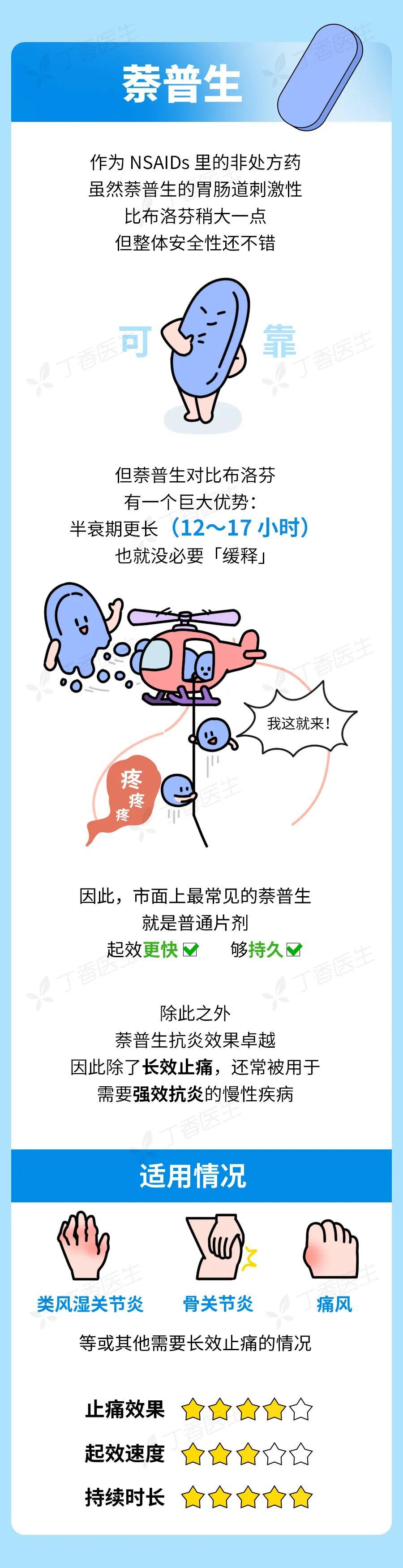 如果希望「一藥撐更久」,也可以直接選用萘普生這種起效速度和維持時間都不錯的 NSAIDs,只要記得嚴格遵守服藥間隔、不要混服不同藥物即可。