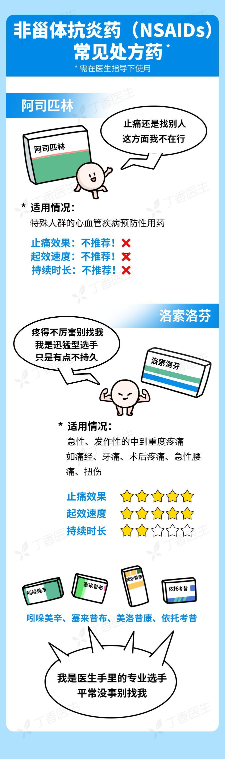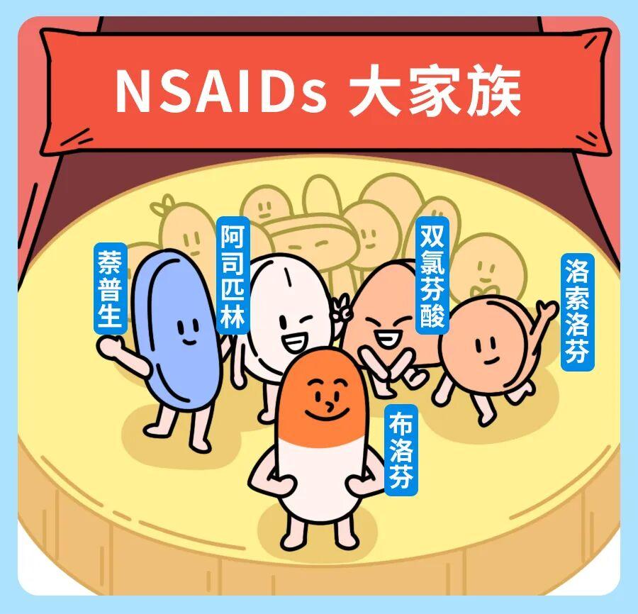 目前市面上共有 50 多類非甾體類消炎藥,大家比較耳熟能詳的有布洛芬、阿司匹林、萘普生、雙氯芬酸、洛索洛芬等。