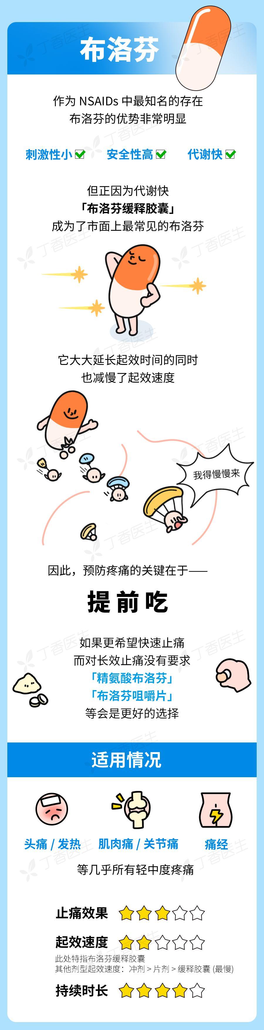其中,大家最熟悉的可能就是「布洛芬」,除了常見的緩釋布洛芬膠囊,還有「精氨酸布洛芬」「布洛芬咀嚼片」等起效更快的類型。