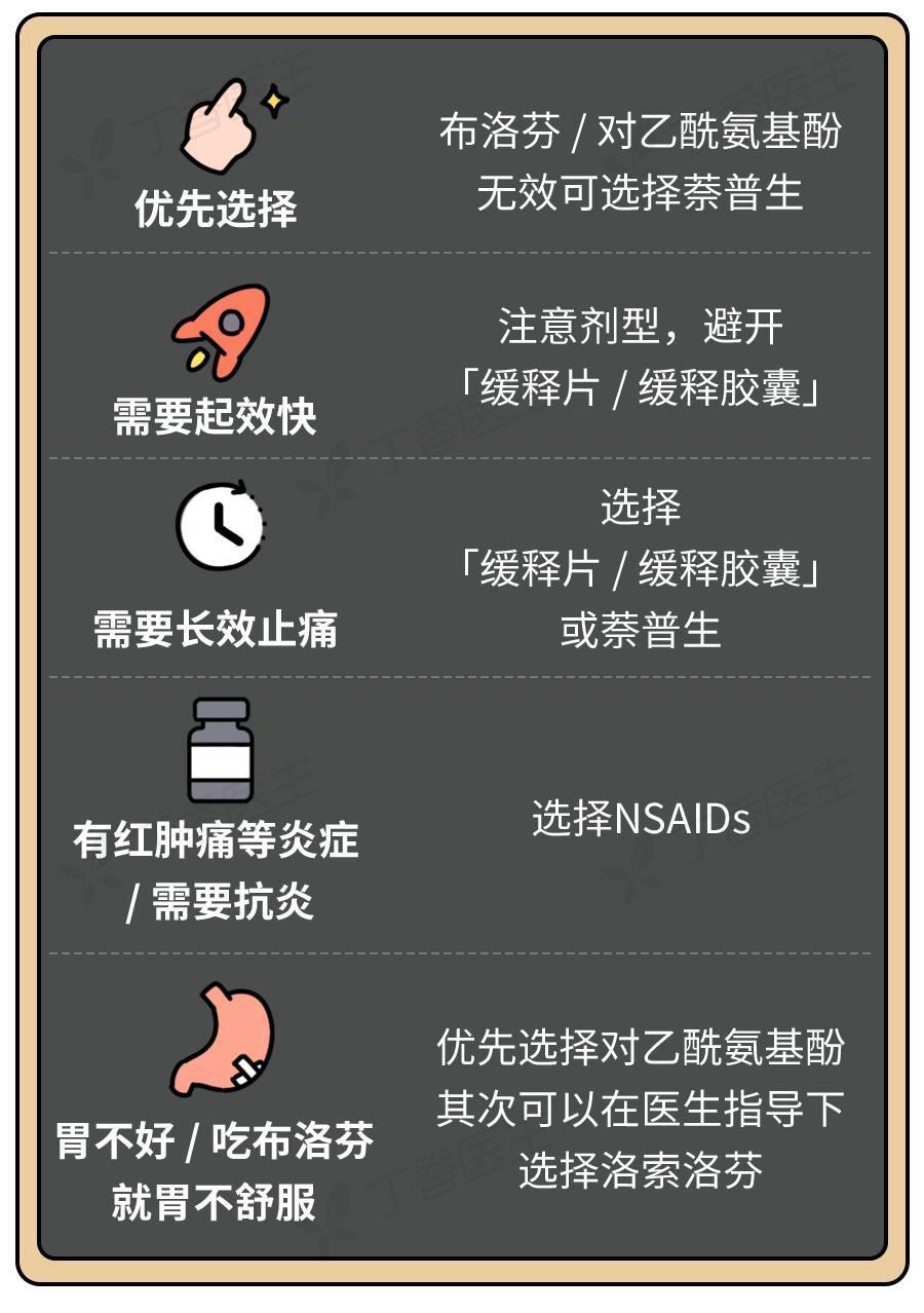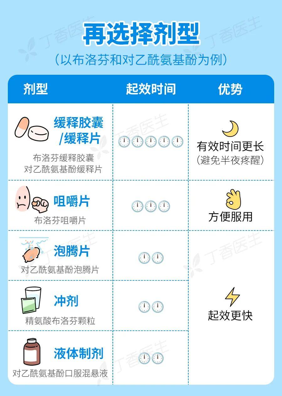 先選擇速效劑型(如精氨酸布洛芬、布洛芬咀嚼片、對乙酰氨基酚等),迅速把血藥濃度拉起來,讓疼痛先停下來。