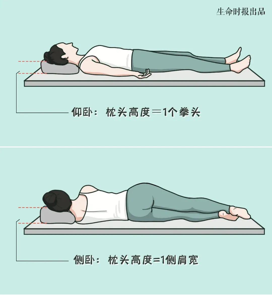 枕頭高度不宜過低,習慣仰臥的人,枕頭高度可與自己的拳頭高度一致;習慣側睡的人,枕頭高度可與自己一側的肩寬一致。