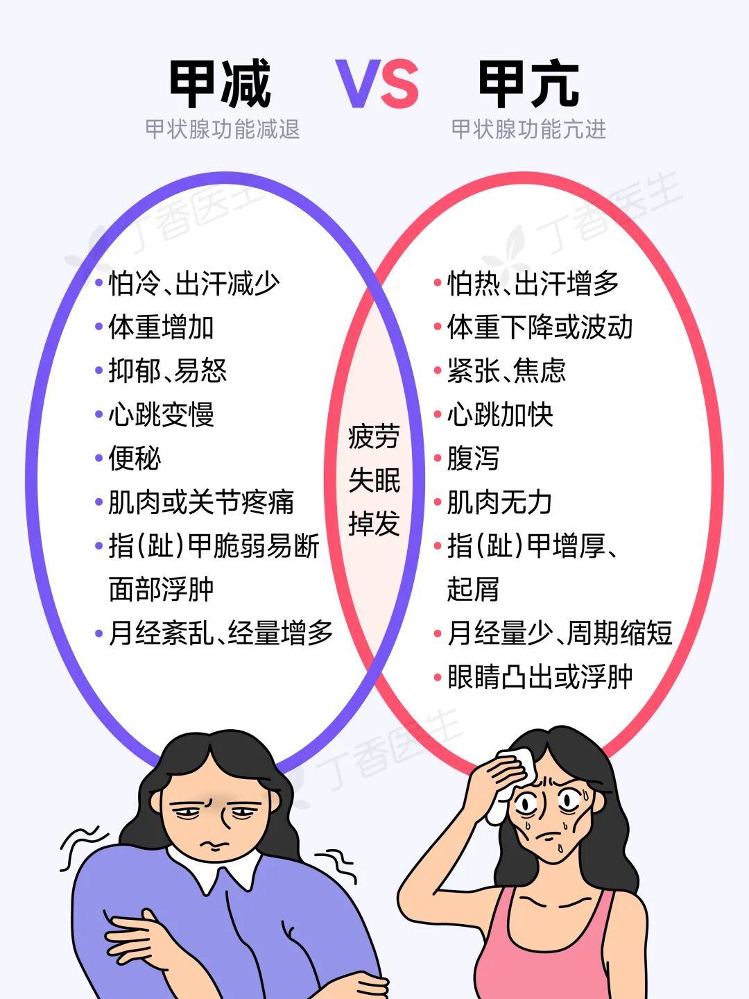 下面這張圖給大家更全面地總結了一下甲減和甲亢的症狀。可以看到,甲減和甲亢的症狀常常相反,但也有相似之處,比如都會感到疲勞、失眠或脫髮。