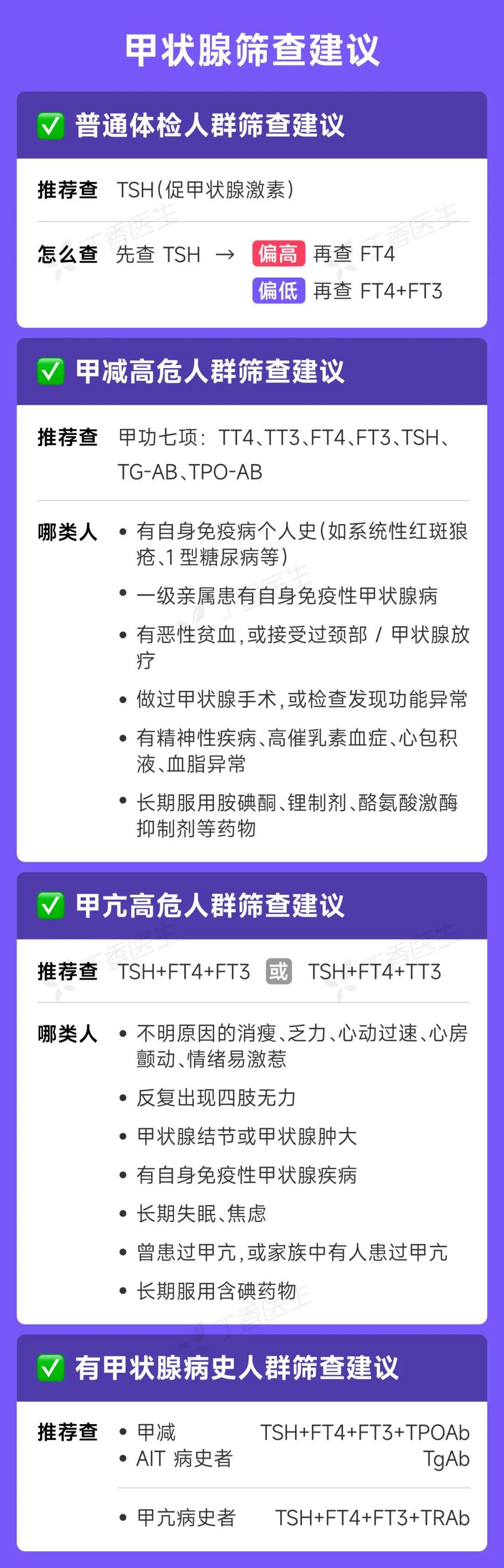 如果你屬於甲狀腺疾病高危人羣(比如有家族史、免疫病、做過甲狀腺手術、發現過結節等),檢查時也記得提醒醫生加查 TSH、FT4、FT3,必要時加上抗體(TPOAb、TgAb、TRAb)。