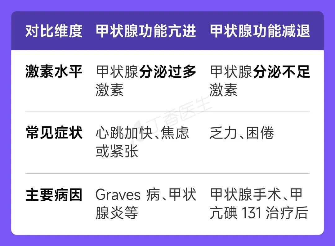 甲狀腺功能出現異常,會工作過度或不足,導致激素分泌過多或過少,臨牀上主要分爲兩類:甲亢和甲減。