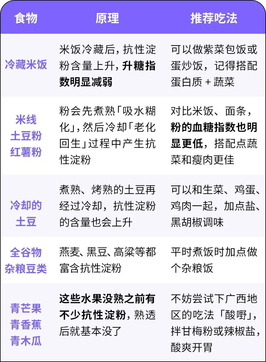 ✅ 措施:在日常飲食中,咱們可以在主食中增加抗性澱粉的比例,具體怎麼做,給大家整理好表格啦——