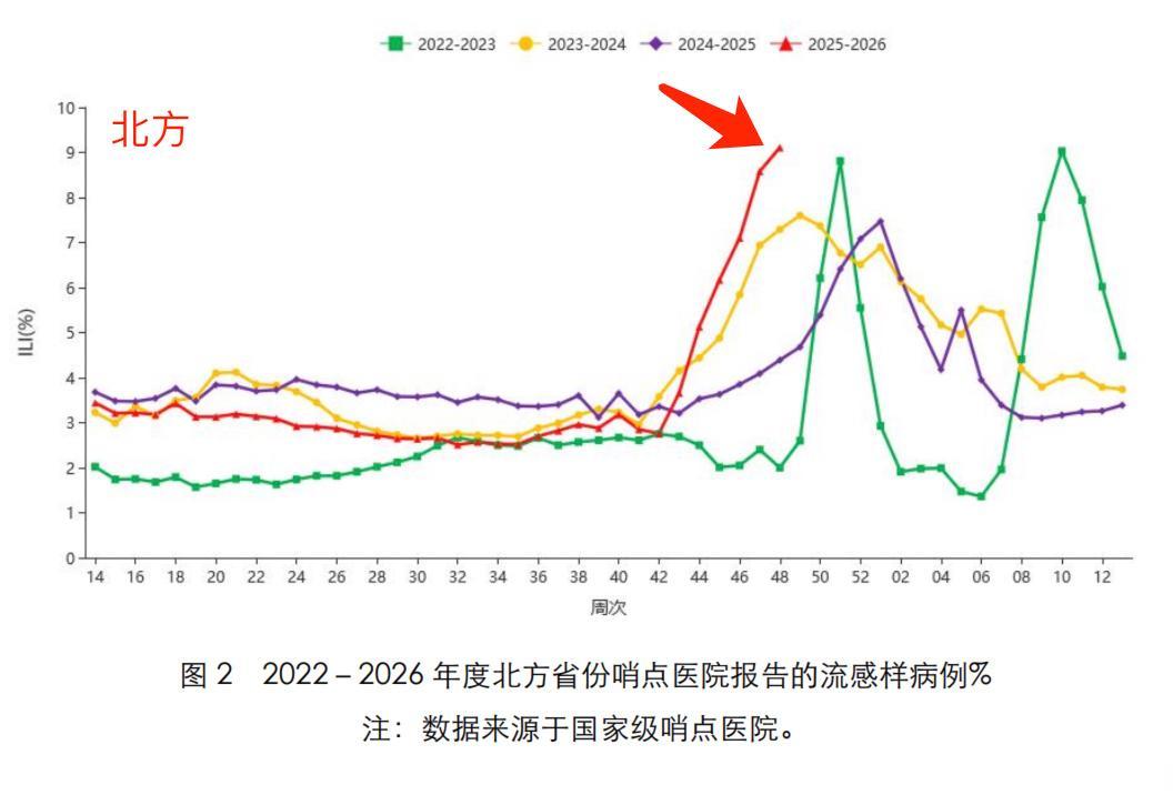 圖注:南方和北方省份流感樣病例佔門急診病例的比例,均持續上升,高於2022、2023、2024年同期水平。
