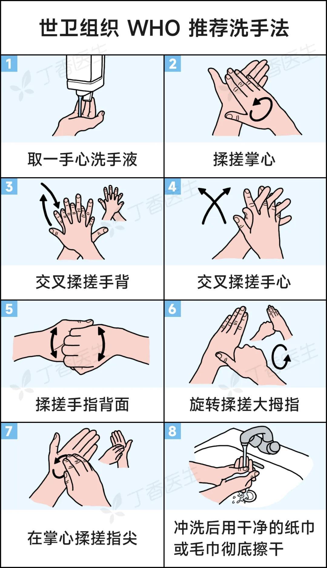 洗手勤一點、仔細一點,尤其外出回家後等,一定要儘快用肥皂或洗手液 + 流動水把手洗乾淨,洗夠 20 秒。這是減少病毒傳播最重要且有效的生活措施。