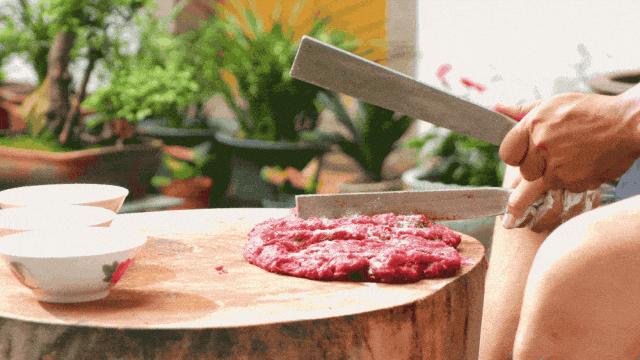 在不多添加其他配料的情況下,只能由新鮮的牛肉加上反覆高強度捶打才能做到。不新鮮的牛肉很難靠捶打做到這樣彈牙。