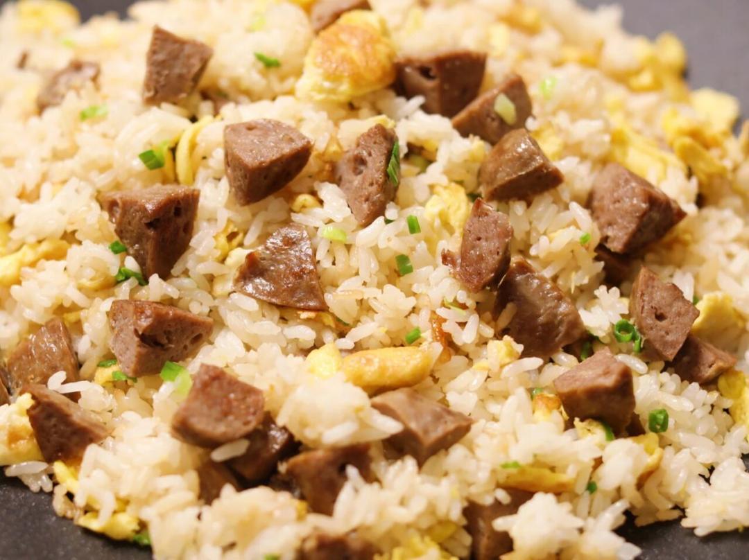 直接把牛肉丸對半切開,正反面煎個 2 分鐘,打 3 個雞蛋、混進米飯一起炒即可!