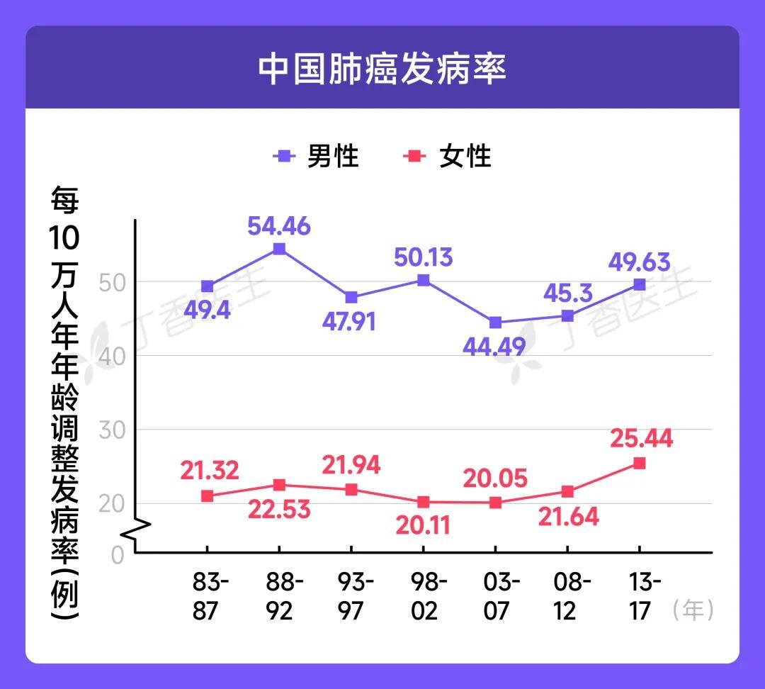 一項基於五大洲癌症發病率數據庫的研究顯示,從 1983 年~2017 年,我國肺癌發病率: