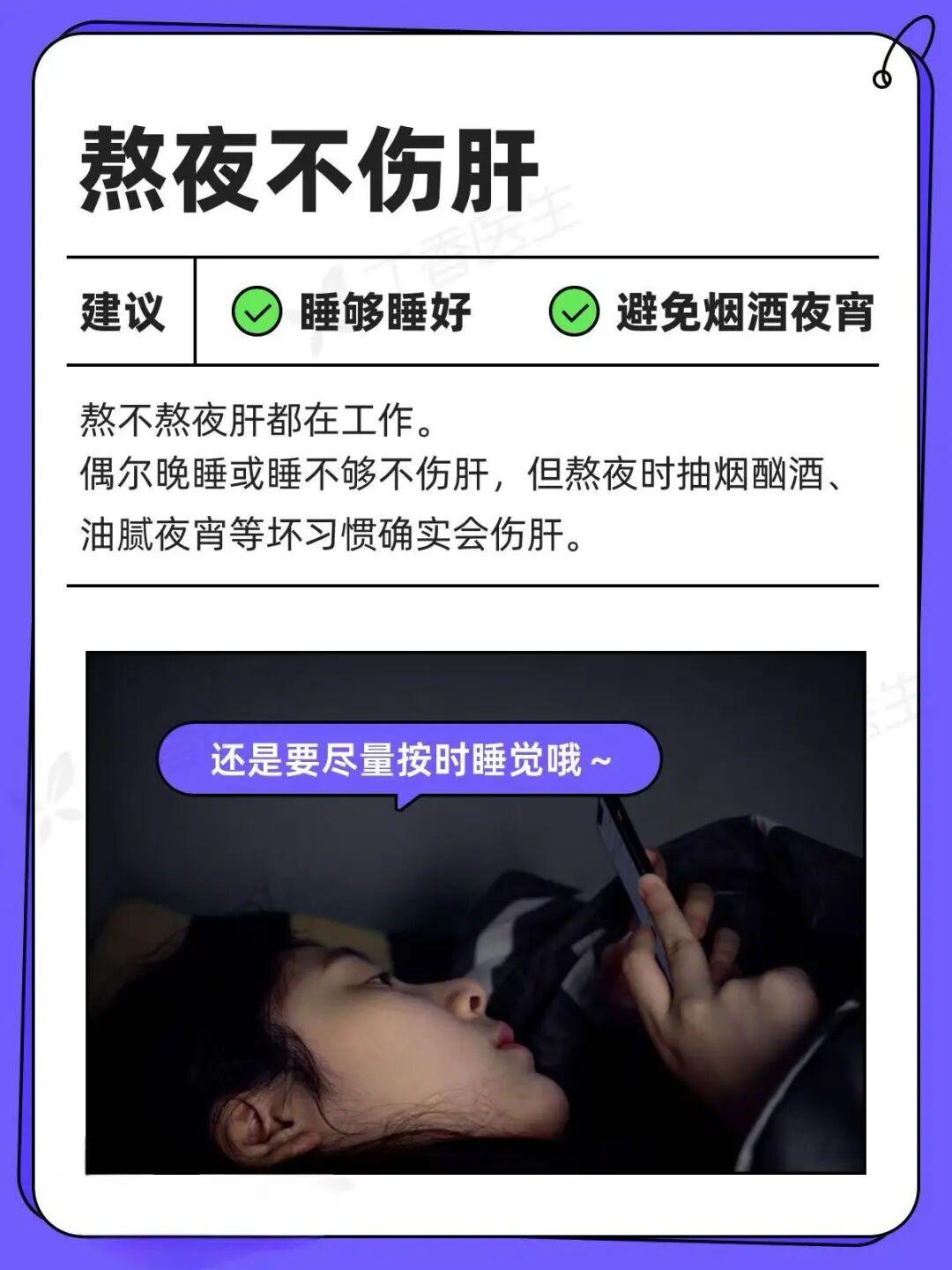 ➋ 晚睡這件事,與肝無關。真正傷肝的是熬夜時伴隨的油膩夜宵、菸酒燒烤;以及睡不規律、睡不夠、睡不好。睡不夠、睡不好對人體會有很大傷害,比如,變成「癡呆」的概率極大提升。所以,還是建議大家規律作息,保證睡夠 7~9 小時;