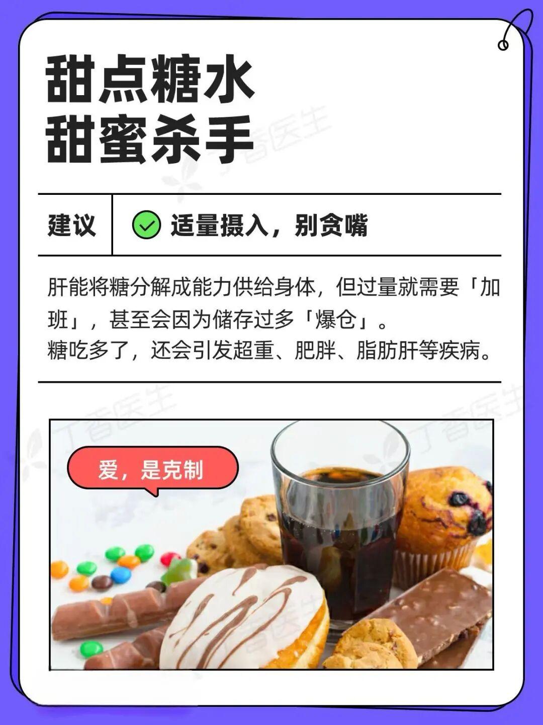➏ 高油高脂高糖的飲食,肝真的不喜歡。將食物轉化成人體需要的營養物質,排出不需要的廢物或毒素,是肝的工作,如果攝入太多,肝就容易「爆倉」,久而久之,脂肪肝等肝臟疾病就出現了;