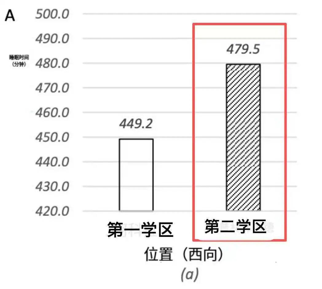 即使在在相同朝西的教室中學習,因爲第二學區的窗戶更大,學生的睡眠的時間平均每晚比第一學區的學生多睡 30.3 分鐘。