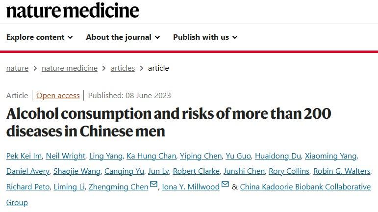《Nature Medicine》上一項研究評估了我國成年男性飲酒與200多種疾病風險之間的關係,結果發現飲酒與61種疾病發生風險增加相關。