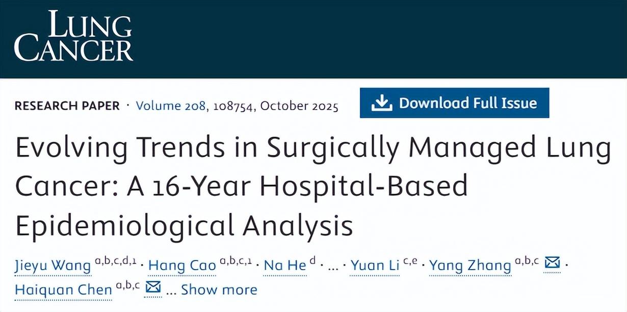 [5] Wang J, Cao H, He N, Liu X, Fu F, Deng C, Li Y, Zhang Y, Chen H. Evolving Trends in Surgically Managed Lung Cancer: A 16-Year Hospital-Based Epidemiological Analysis. Lung Cancer. 2025 Oct;208:108754. doi: 10.1016/j.lungcan.2025.108754. Epub 2025 Sep 16. PMID: 40986991