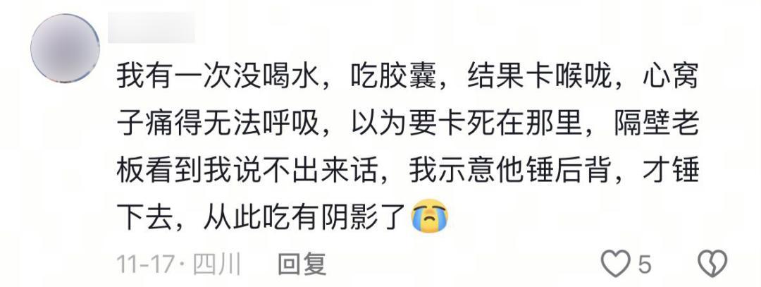 要麼吞半天吞不下去,要麼好不容易嚥下去了又感覺堵在胸口、喉嚨管裏……捶胸頓足搞半天,差點被一顆小藥丸「送走」。