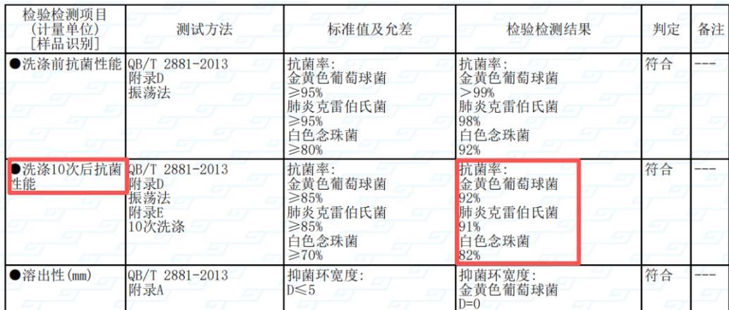 經過 10 次洗滌後,金黃色葡萄球菌、肺炎克雷伯氏菌和白色念珠菌抗菌率分別爲 92%、91% 和 82%!