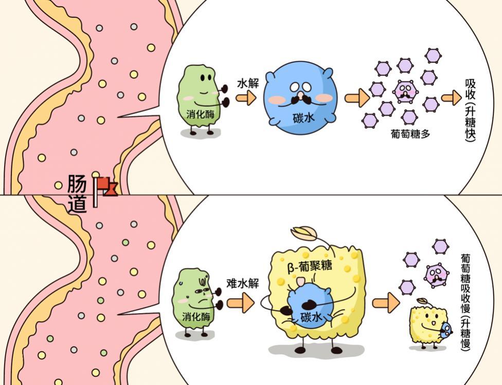 β-葡聚糖能使胃排空速率減慢,減少胃腸道消化酶對碳水化合物的水解,維持飽腹感[2]。