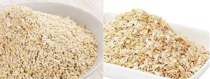 左:其他燕麥麩皮,碾磨不足,麩皮成碎顆粒狀,連帶澱粉較多;