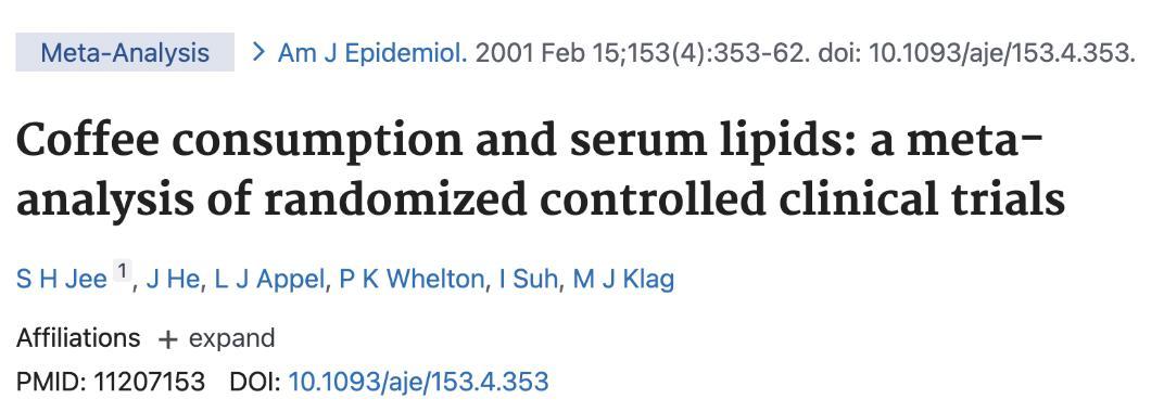 [1]Jee SH, He J, Appel LJ, Whelton PK, Suh I, Klag MJ. Coffee consumption and serum lipids: a meta-analysis of randomized controlled clinical trials. Am J Epidemiol. 2001 Feb 15;153(4):353-62. doi: 10.1093/aje/153.4.353.